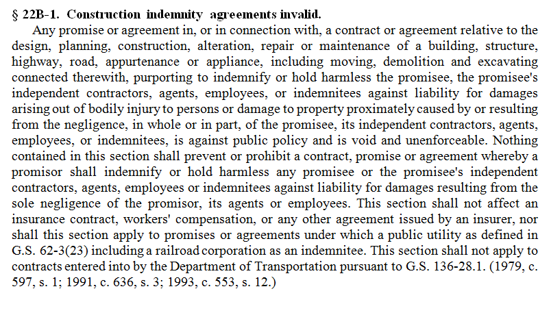 Our so-called anti-indemnity statute can be found at N.C. Gen. Stat. § 22B-1, and I’ve reproduced it in full below (click the image for a larger version):